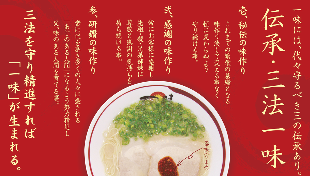 今後も「伝承・三法」≪壱 秘伝の味作り 弐 感謝の味作り 参 研鑽の味作り≫のスローガンを忠実に守り、食材・製法・衛生・サービス・教育にとことんこだわって、もっとお客様の笑顔が見える店づくりを念頭に、スタッフ一同日々精進して参ります。